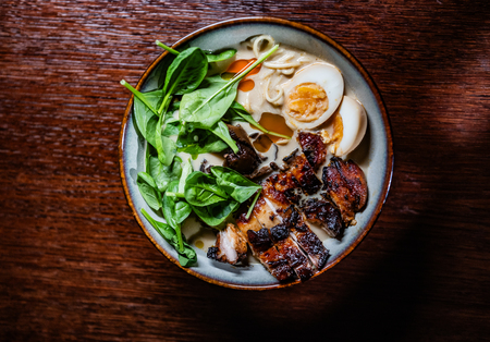 Makaron ramen/ bulion wołowy/ tare na bazie miso/ marynowane udko z kurczaka/ jajko ajitama/ grzyby shiitake/ szpinak baby/ oliwa szczypiorkowa/ olej chilli