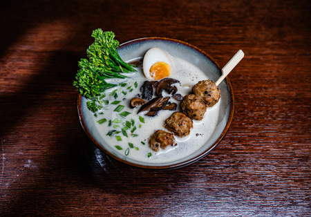 Makaron ramen/ bulion wieprzowy/ tare na bazie sosu sojowego/ wieprzowe Niku Dango/ jajko ajitama/ grzyby shiitake/ brokuł bimi/ olej z palonego czosnku/ szczypior