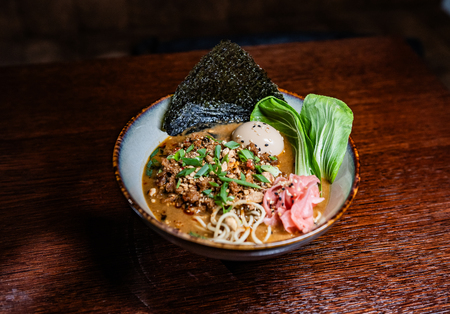 Makaron ramen/ bulion wieprzowy/ tare na bazie pasty miso oraz pasty sezamowej/ wieprzowina hikiniku/ jajko ajitama/ pak choi/ la-yu/nori/ imbir marynowany/ prażone orzechy ziemne/ sezam/ szczypior